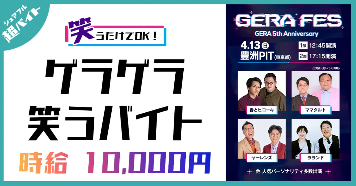 「GERAFES」は、ファンとアーティストが一体となり、笑いを楽しむことを目的としたトークイベントです。様々な芸人が出演し、観客とともに笑いの空間を作り出します。今回のイベントでは、シェアフルが、ゲラゲラ笑いながらバイトをするというユニークな企画を通じて、参加者へ特別な体験を提供します。