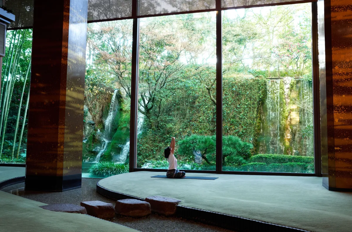 ヨガ体験は、ホテルのメインラウンジで行われます。このラウンジは大きな窓から日本庭園が一望できる開放的な空間で、名画やクリスタルを使用した美しいシャンデリアが設置されています。心地よい風を感じながら、晴れた日の光を浴びてヨガに取り組むことができ、季節や天候に左右されない快適な環境が整っています。