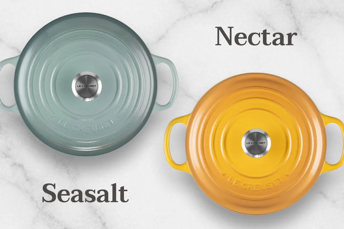 ル・クルーゼといえば、その豊かなカラーバリエーションと高い品質で知られるキッチンウェアブランドです。2023年に創業100年を迎えるこのブランドは、世界中に多くのファンを持っています。特に特徴的なオレンジや深いチェリーレッドは、ル・クルーゼの象徴的な色として広く認知されています。しかし、最近新たに加わった「ネクター」と「シーソルト」は、魅力的な新定番カラーとして注目を浴びています。