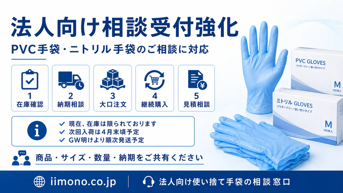 今後も、法人向け手袋の調達において、在庫や納期、数量の確認をしやすい体制を継続的に整えていく所存です。特にGWなどの変動期間においても、必要な情報を早期に把握できるよう努めます。