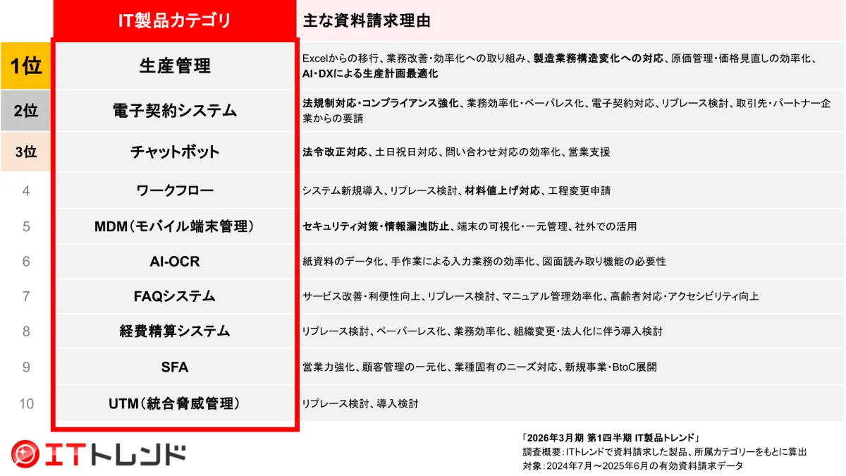 さらに、電子契約関連システムの需要も安定しており、改正電子帳簿保存法の施行が企業の法令遵守意識を高めています。これらの動きが相まって、IT製品に対する関心が高まり、企業は導入の比較検討を行っています。