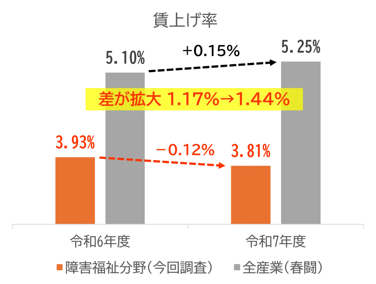 - - 賃金格差の現状: 一方で、賃上げ率は全産業が前年度比0.15%増であるのに対し、障害福祉分野は0.12%減であり、格差が拡大しています。