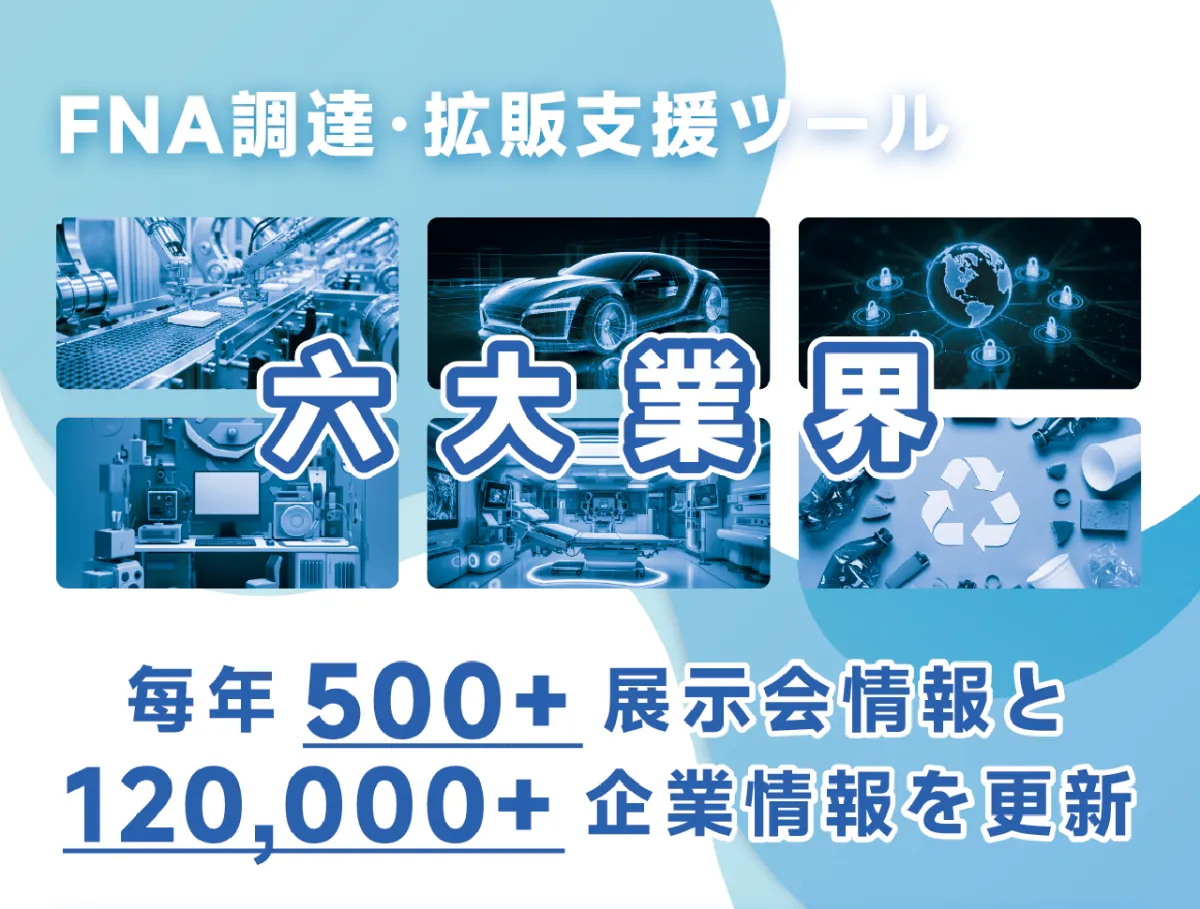「FNA調達・拡販支援ツール」は、膨大な展示会データと企業情報を活用し、製造業の顧客開拓に貢献するためのプラットフォームです。具体的には年間500件以上の展示会情報と12万社以上の企業情報が常に更新されており、特に中国の主要展示会における情報が網羅されています。このデータをもとに、企業は潜在顧客やサプライヤー、パートナー候補を効率的に検索することが可能です。