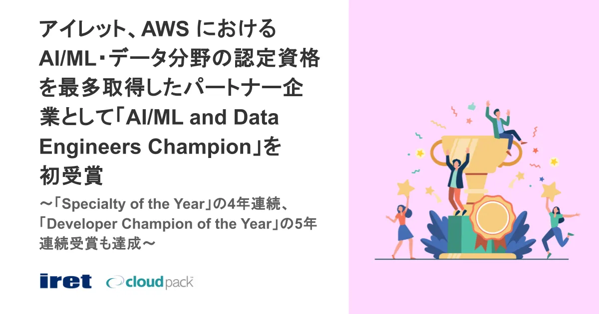 「AI/ML and Data Engineers Champion」は、AI/ML・データ分野の認定資格を所有する個人が最も多く所属しているパートナー企業に与えられる新設の賞です。これにより、アイレットのエンジニアたちが高いスキルを持ち、多くの資格を保有していることが証明されました。