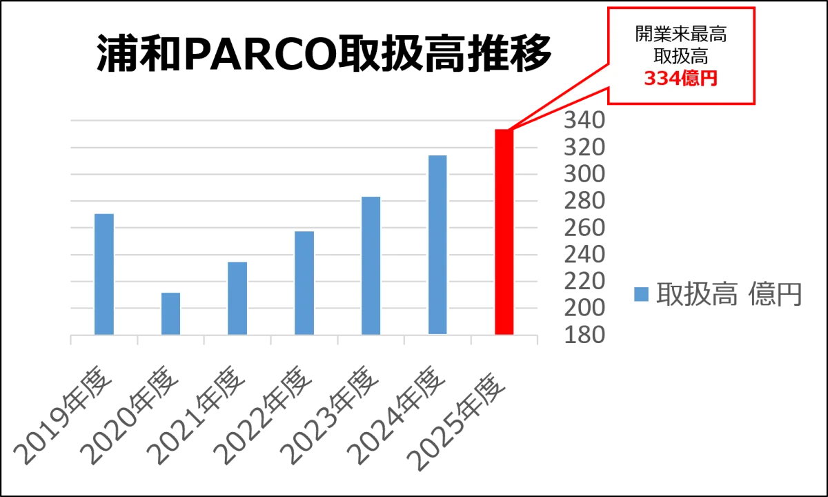浦和PARCO(店長:浜信吾)が、2025年度の取扱高334億円を達成しました。これは前年度比105.9%の成長を示しており、実に3期連続で過去最高の取扱高を更新したことになります。