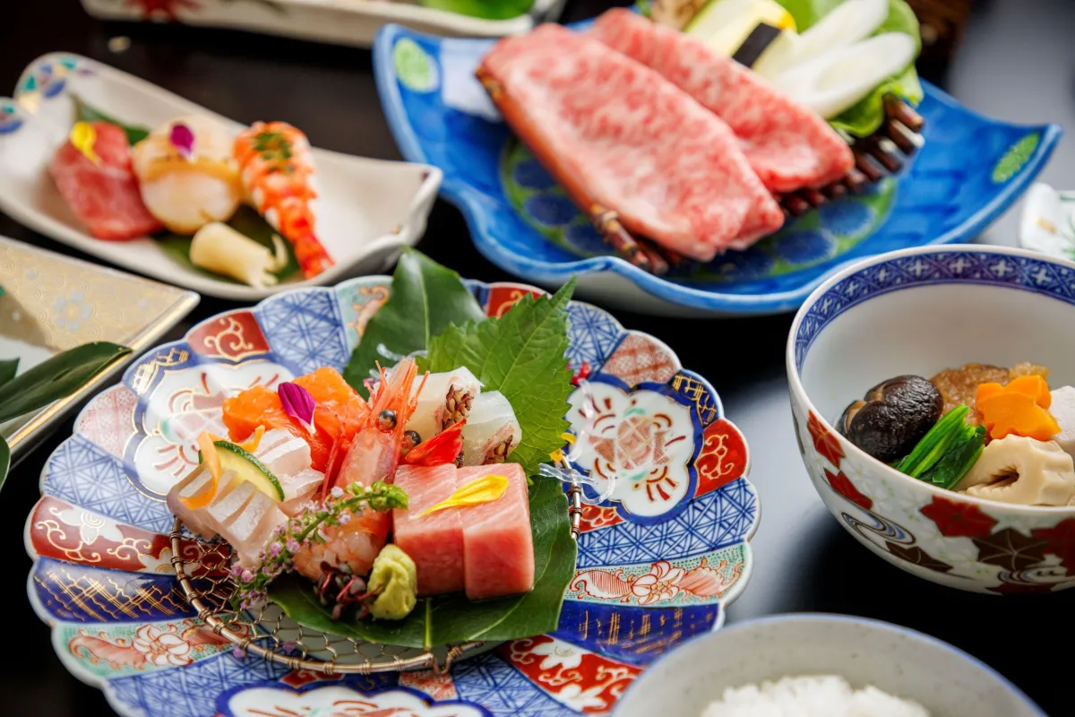 「わんわんリゾート 矢田屋松濤園」では、基本会席と特選料理の2つから選べる秋の会席料理が用意されています。料理はどれも金沢で仕入れた地元食材を中心に、季節を感じさせる美しいプレゼンテーションが特徴です。