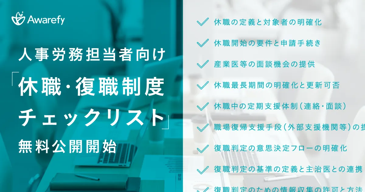 株式会社アウェアファイ(東京都新宿区、代表取締役 CEO 小川 晋一郎)は、社会保険労務士法人エスネットワークス(本社:東京都千代田区、代表理事 江頭孝弘)の監修のもと、「メンタルヘルス不調者の休職・復職制度チェックリスト(全17項目)」を新たに開発し、本日より無料で公開いたしました。