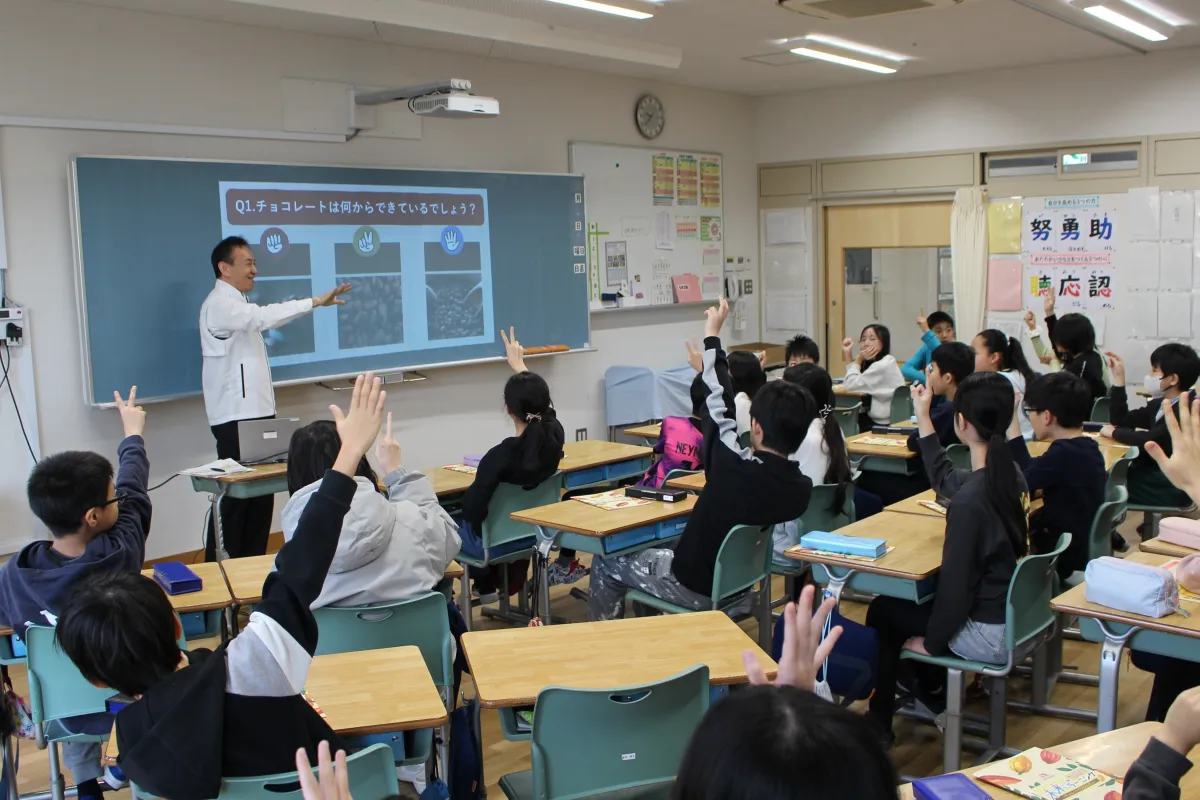 授業の目的は、バレンタインデーが迫る中、チョコレートの原材料となるカカオの生産地で直面している社会的課題を、子どもたち自身が考えるきっかけを提供することです。森社長は、チョコレートが持つ意義や、カカオ農家やその地域における子どもたちの現状について語り、参加した生徒たちは真剣に耳を傾けました。