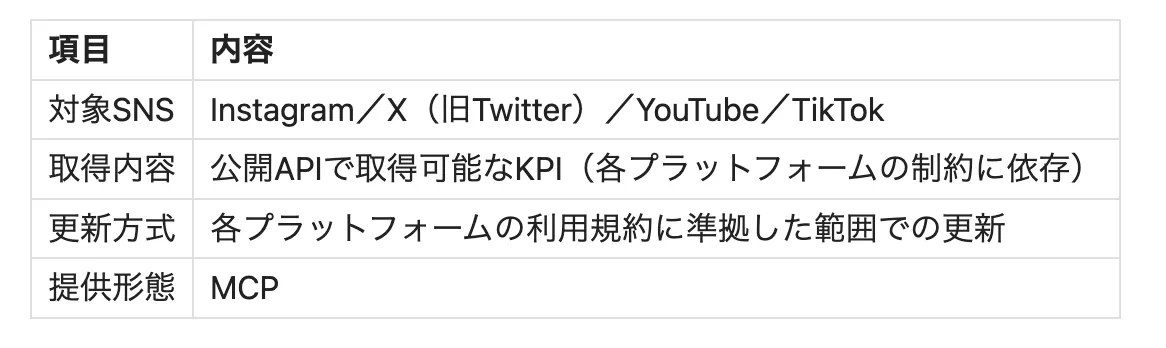 - - 利用範囲の確実な運用: 各プラットフォームのAPI制限に基づいたデータ活用ができる