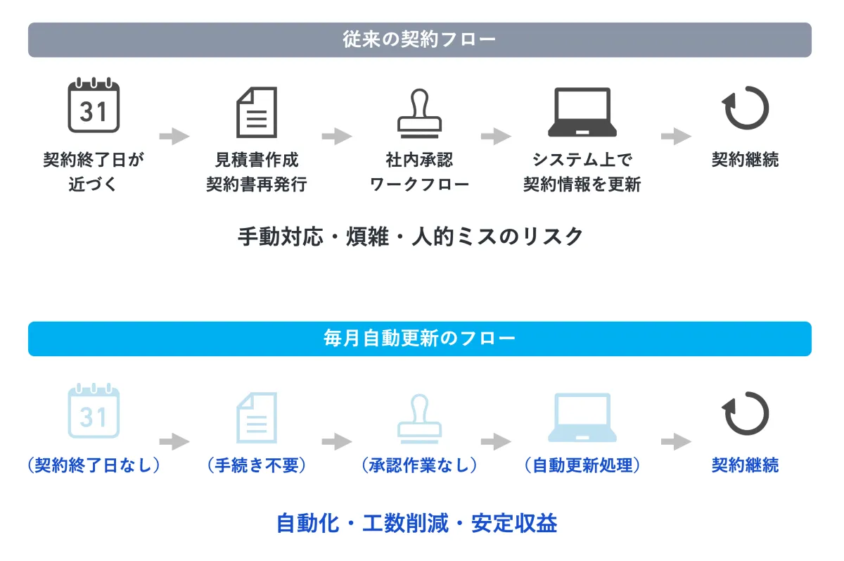 従来の契約更新の際には、営業部門やバックオフィスが様々な手続きを行う必要がありました。契約書の再発行や見積書の作成、内部承認フロー、システム上の契約データ更新など、多大な労力を要していました。しかし、「ソアスク」の新機能である毎月自動更新により、これらの手続きが大幅に簡素化されることが期待されています。これにより事務処理負荷が軽減され、人的ミスのリスクも減少するでしょう。