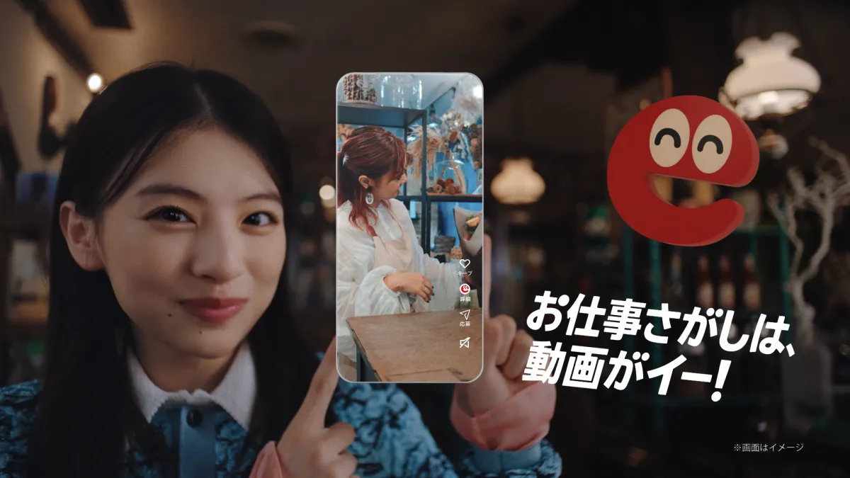 求人動画検索機能の導入に合わせて、俳優の出口夏希さんを起用した新しいCMも公開されました。「動画で仕事が探せる」というコンセプトが掲げられたこのCMでは、出口さんがカフェで『イーアイデム』を閲覧する姿が描かれています。彼女が仕事内容の動画をスワイプするたびに、さまざまな職場の映像が次々と表示され、「雰囲気イイ」「仲イイ」「キャライイ!」と驚く様子が印象的です。