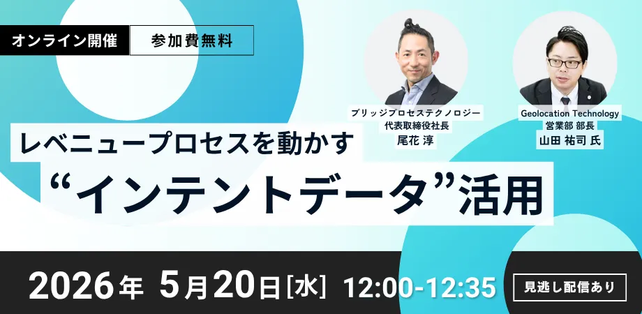 企業の購買行動が変わりつつある昨今、事前のリサーチ段階での適切な戦略が求められています。そこで、ブリッジプロセステクノロジー株式会社と株式会社Geolocation Technologyの共催による、ウェビナー「レベニュープロセスを動かす“インテントデータ”活用」が2026年5月20日(水)に開催されます。本ウェビナーでは、BtoB企業における問い合わせ前の行動から、どのように関心兆候を把握し、それを営業やマーケティングにどう生かしていくかを解説します。