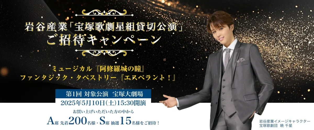 岩谷産業株式会社は2月28日より、宝塚歌劇団 星組の特別貸切公演へ215名を招待するキャンペーンを開始します。この公演には、イメージキャラクターである暁 千星さんが出演する「ミュージカル『阿修羅城の瞳』」や「ファンタジック・タペストリー『エスペラント!』」が含まれています。以下に、キャンペーンの詳細をご紹介します。