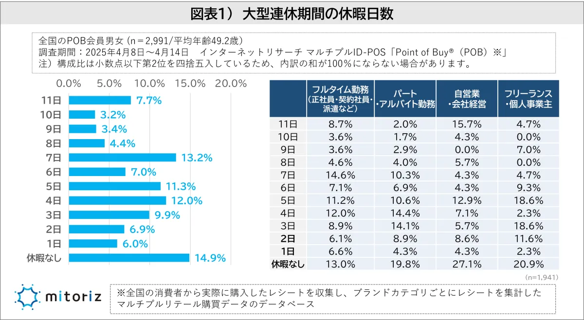 まず、休暇日数に関するデータを見てみましょう。「休暇あり」とした場合では「7日」が13.2%で最も多く、次に「4日」が12.0%ですが、悩みどころは「休暇なし」が14.9%であり、これは前年に引き続き続いています。特に、就労状況を考慮すると、自営やフリーランスの人々は多くの休暇日数を取れる一方で、パート・アルバイトの人たちは過半数が休暇の予定がないという結果から、労働環境の影響が伺えます。