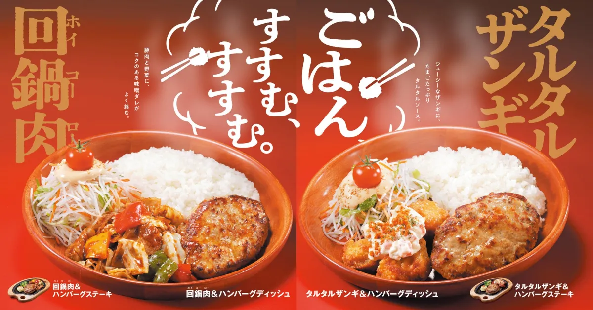 新メニュー「ごはん、すすむ、すすむ。」では、ハンバーグの新たな相方として「タルタルザンギ」と「回鍋肉」が加わります。それぞれ、食欲をそそる特徴を持った料理です。
