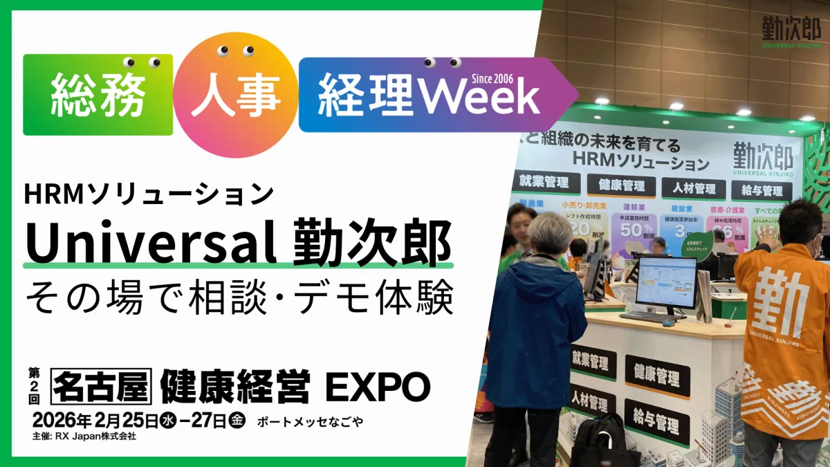 勤次郎株式会社が、2026年2月25日から27日まで名古屋のポートメッセなごやで開催される「第8回【名古屋】総務・人事・経理Week」に参加します。特に「健康経営 EXPO」にブースを構え、最新のHRMソリューション『Universal 勤次郎』をご紹介します。