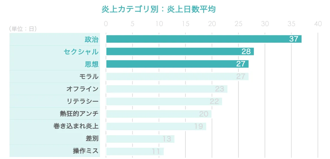 - - 政治的な投稿の炎上: 政治関連の投稿は炎上日数が長くなる傾向があり、注目を集めやすい。