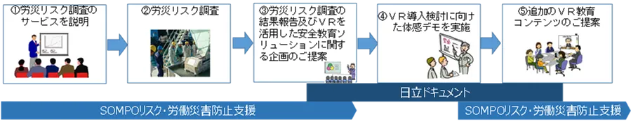 SOMPOリスクでは、現地で労働災害のリスクを調査し、その結果を基に日立ドキュメントが提供するVRを活用した教育ソリューションを提案します。このプロセスを通じて、従業員は自分の職場で起こり得るリスクを具体的に知ることができ、対策を講じるための第一歩となります。具体的には、年間100件以上のリスク調査により、専門コンサルタントが現場で実情を把握し、不安全状態や行動を洗い出します。
