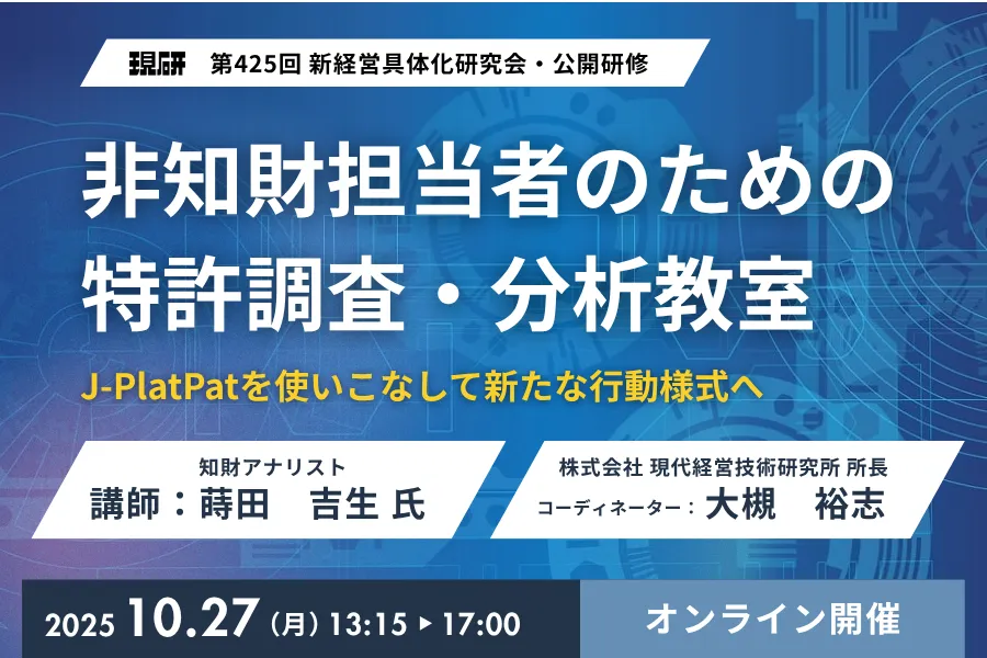 株式会社現代経営技術研究所(以下、現研)は、2025年10月27日(月)に第425回新経営具体化研究会・公開研修を開催します。今回は「非知財担当者のための特許調査・分析教室」と題し、特許情報プラットフォーム「J-PlatPat」を利用した特許調査のノウハウを学びます。講師には知財アナリストの蒔田吉生氏を迎え、オンラインでの研修となります。