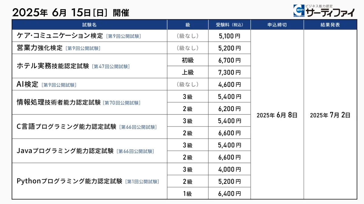 2025年に開催される公開試験には、以下の資格が含まれています。