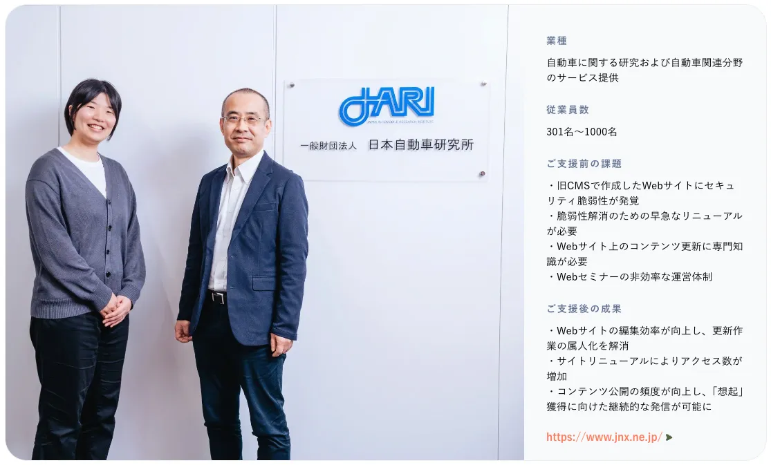 株式会社100(東京都世田谷区)が、一般財団法人日本自動車研究所 JNXセンターのHubSpot導入事例を発表しました。この事例では、Webサイトのセキュリティ向上や運用効率化を図るために行ったCMSの移行について詳しく紹介されています。