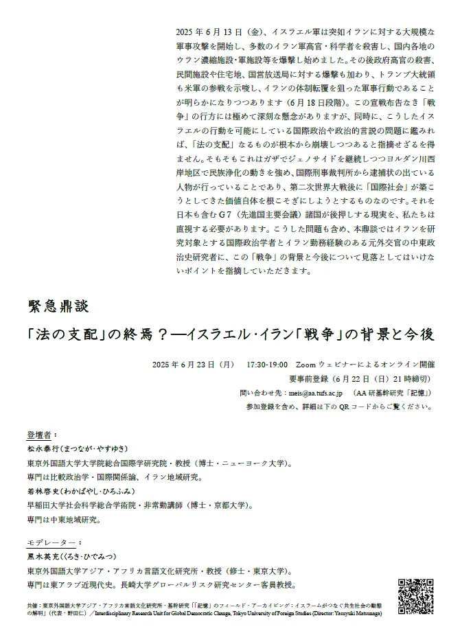 2025年6月13日、イスラエル軍がイランに対して大規模な軍事攻撃を行ったことで、中東は再び緊張の高まる状況に突入しました。この「戦争」とも呼ばれる事態は、国際社会で確立されてきた「法の支配」を根底から揺るがしています。これに応じて、東京外国語大学のアジア・アフリカ言語文化研究所(AA研)は、緊急の鼎談を開催します。
