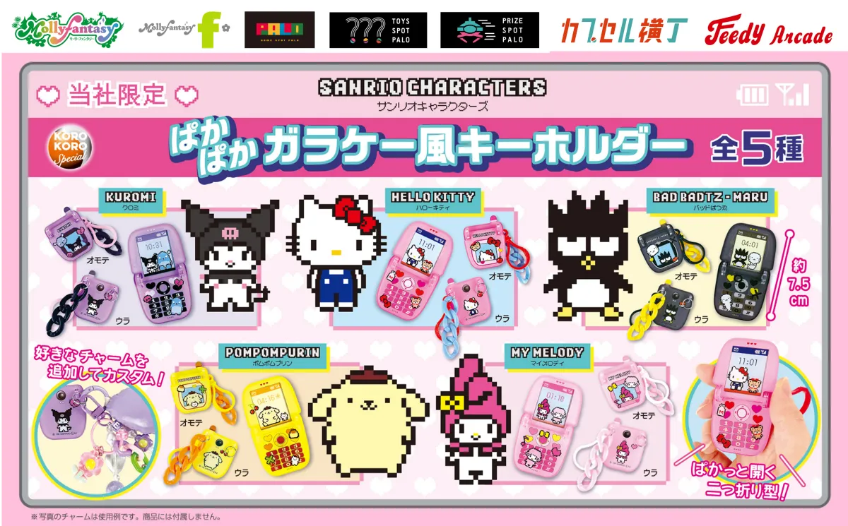 この新しいカプセルトイは、サンリオの人気キャラクター、「ハローキティ」、「マイメロディ」、「ポムポムプリン」、「バッドばつ丸」、「クロミ」の全5種類がラインナップされています。特に注目は、レトロなドット絵があしらわれた二つ折り型のデザインで、まるで懐かしい携帯電話のような印象です。もちろん、キーホルダーとしても使用でき、自分好みにチャームを追加してカスタマイズする楽しみもあります。