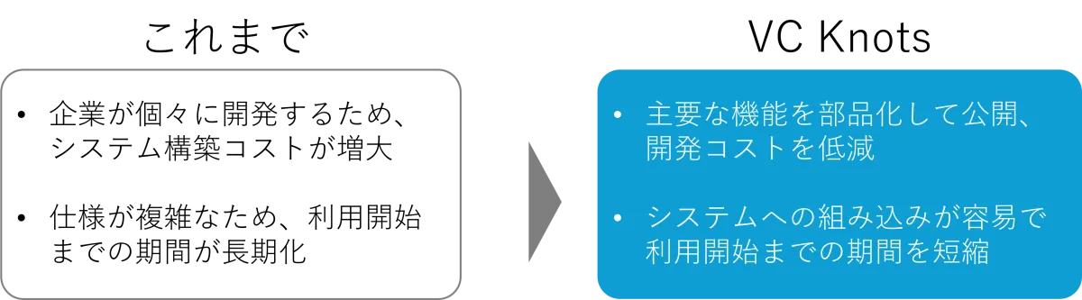 このような機能により、企業や組織は個別に同様のシステムを構築する必要がなくなり、開発の手間やコストを大幅に削減できます。また、VC Knotsは欧米で進んでいる国際的な標準規格に対応しており、グローバルに通用するシステムを容易に構築することができます。このことから、海外市場への展開からも十分に利用の可能性が期待されています。