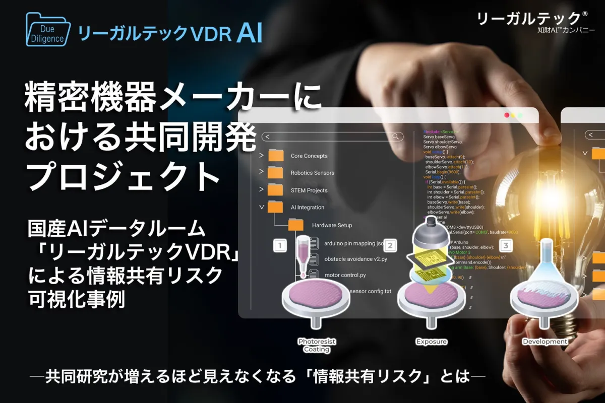 そこで、リーガルテック株式会社は、精密機器メーカーの開発部門において、独自のAI活用型バーチャルデータルーム(VDR)「リーガルテックVDR AI」を初めて導入し、その事例を公開しました。このシステムは、情報共有の設計と制御を可能にするものであり、開示の明確化とログの可視化を通じて、情報共有のリスクを抑制しつつプロジェクトを推進します。