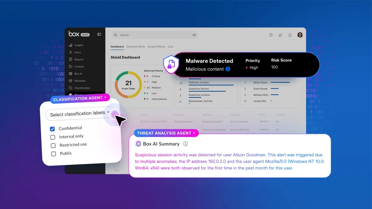 Box Shield Proは、従来のBox Shieldを基に構築されたもので、AIエージェントが組み込まれています。このAIエージェントにより、ユーザーはコンテンツの自動分類や脅威の分析が可能となり、セキュリティ対策を強化することができます。ユーザーはこれを活用することで、重要なデータを安全に保ちながら、迅速に脅威に対処できるようになります。