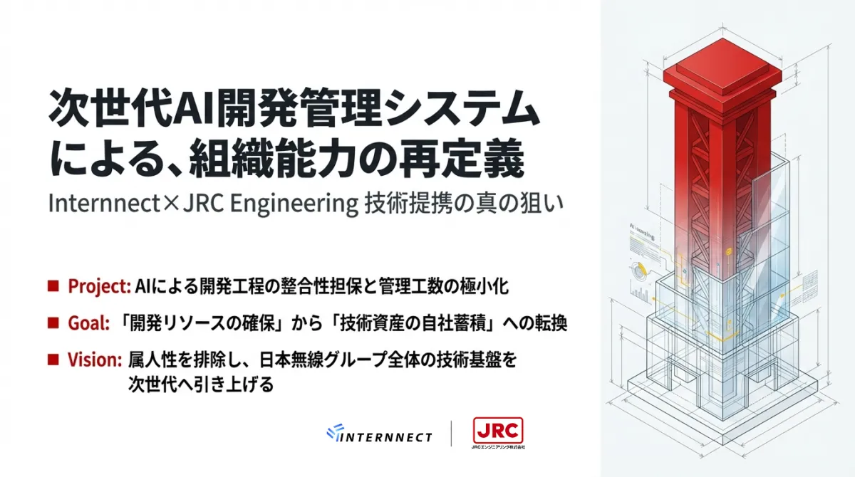 JRCエンジニアリング株式会社と株式会社Internnectは、技術の革新に向けて、AIを活用した開発管理基盤の共同構築に関する提携を開始することを発表しました。この取り組みは、単なる業務の連携に留まらず、開発工程そのものを再定義し、「再現性のある開発体制」を目指しています。