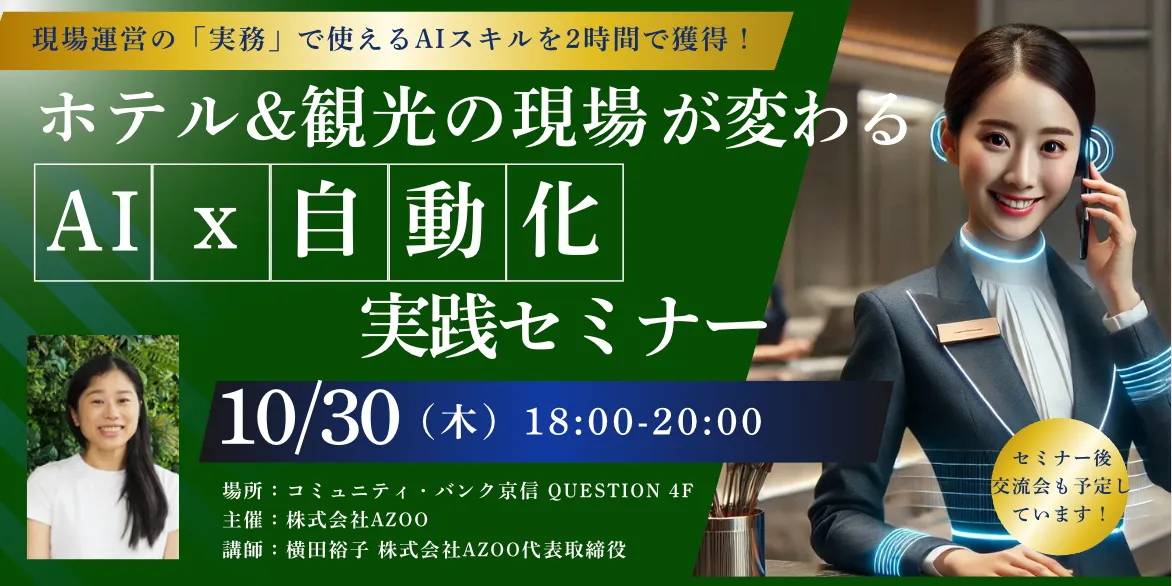 京都市にある株式会社AZOOは、2025年10月30日(金)にコミュニティ・バンク京信 QUESTIONにて、宿泊業界向けの「AI活用実践セミナー」を開催します。このセミナーは、急速に進行するDX(デジタルトランスフォーメーション)を通じてホテルや旅館、観光業界の課題を解決することを目的としています。