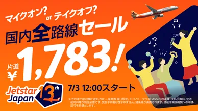 ジェットスター・ジャパンが2025年7月3日(木)に就航13周年を迎えるのを記念して、「マイクオン?orテイクオフ?国内全路線セール」を開催します。このセールでは、全国の路線にわたって片道1,783円という特別な運賃を提供します。
