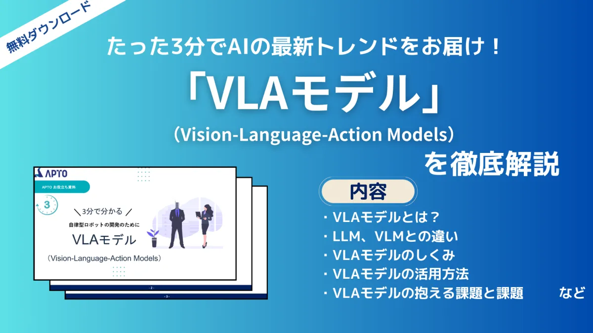 株式会社APTOが、ロボティクスや自動運転技術における重要な「VLAモデル」の資料を無料で公開しています。この資料は、VLAモデル(Vision-Language-Action Models)についての基礎的な知識を提供し、技術に関心のある企業やエンジニアにとって貴重なリソースとなっています。