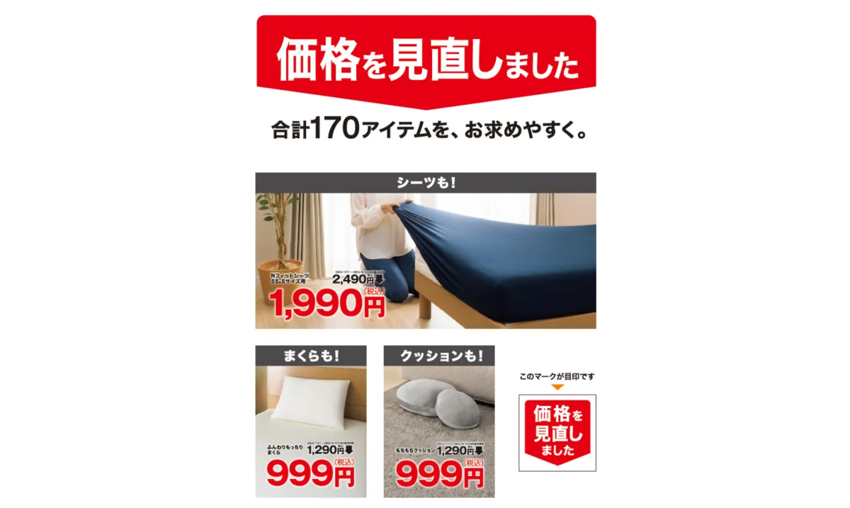 ニトリの目的は「日々の暮らしを彩るアイテムをお手頃価格で揃えたい」という顧客の期待に応えることです。具体的には、毎日使用する枕や寝具、さらには部屋の中で使うクッションやスリッパなど、生活必需品の価格を見直しを行いました。これにより、必要なアイテムを気軽に選べるようにしています。