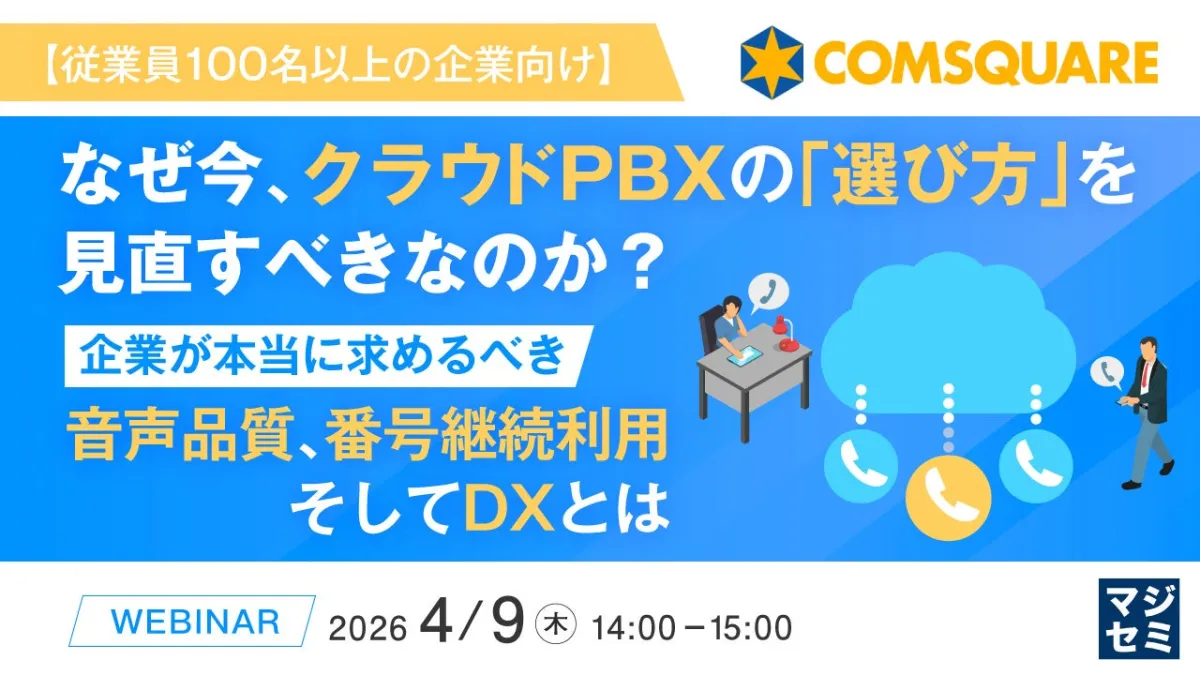 主催は株式会社コムスクエアで、協力のもと、参加者に役立つ情報を発信し続けます。参加申し込みはウェビナーの詳細ページから可能です。これからのビジネス環境に最適なクラウドPBXを見つけるために、ぜひこの機会をご利用ください。