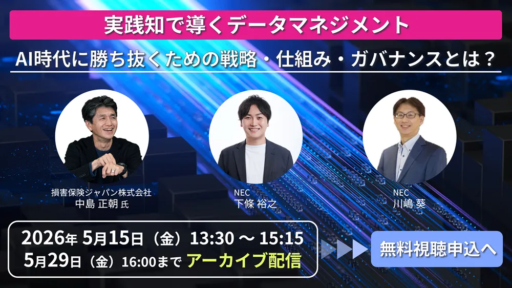 NECは、2026年5月に再放送されるオンラインセミナー「実践知で導くデータマネジメント~AI時代に勝ち抜くための戦略・仕組み・ガバナンスとは?~」を開催します。このセミナーは、業務の効率化に向けたAI導入の進展を受け、特にデータ整備に課題を抱える企業にとって有益な内容となっています。