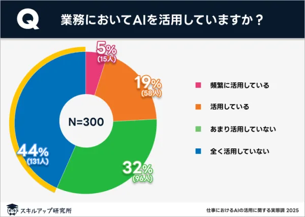 調査結果によると、業務でAIを積極的に活用しているのは全体のわずか25%にとどまっています。具体的には、5%が「頻繁に活用している」、19%が「活用している」と回答。残りの44%は「全く活用していない」と答えており、AIを使いこなせている人材は依然として少数派です。