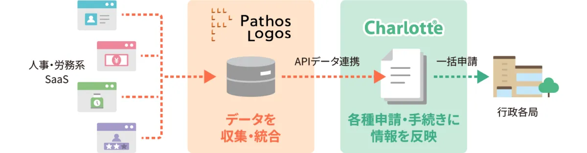 パトスロゴスが提供するのは、HR共創プラットフォームであり、複数の人事データを統合・管理するシステムです。一方、Charlotteは、社会保険や税務に関連した電子申請に特化したクラウドサービスを提供しています。この2つのサービスが連携することで、人事データの収集から申請に至るまでを一貫して支援する体制が構築されます。これにより、従業員の入退社や異動に伴う申請業務もスムーズに行えるようになります。