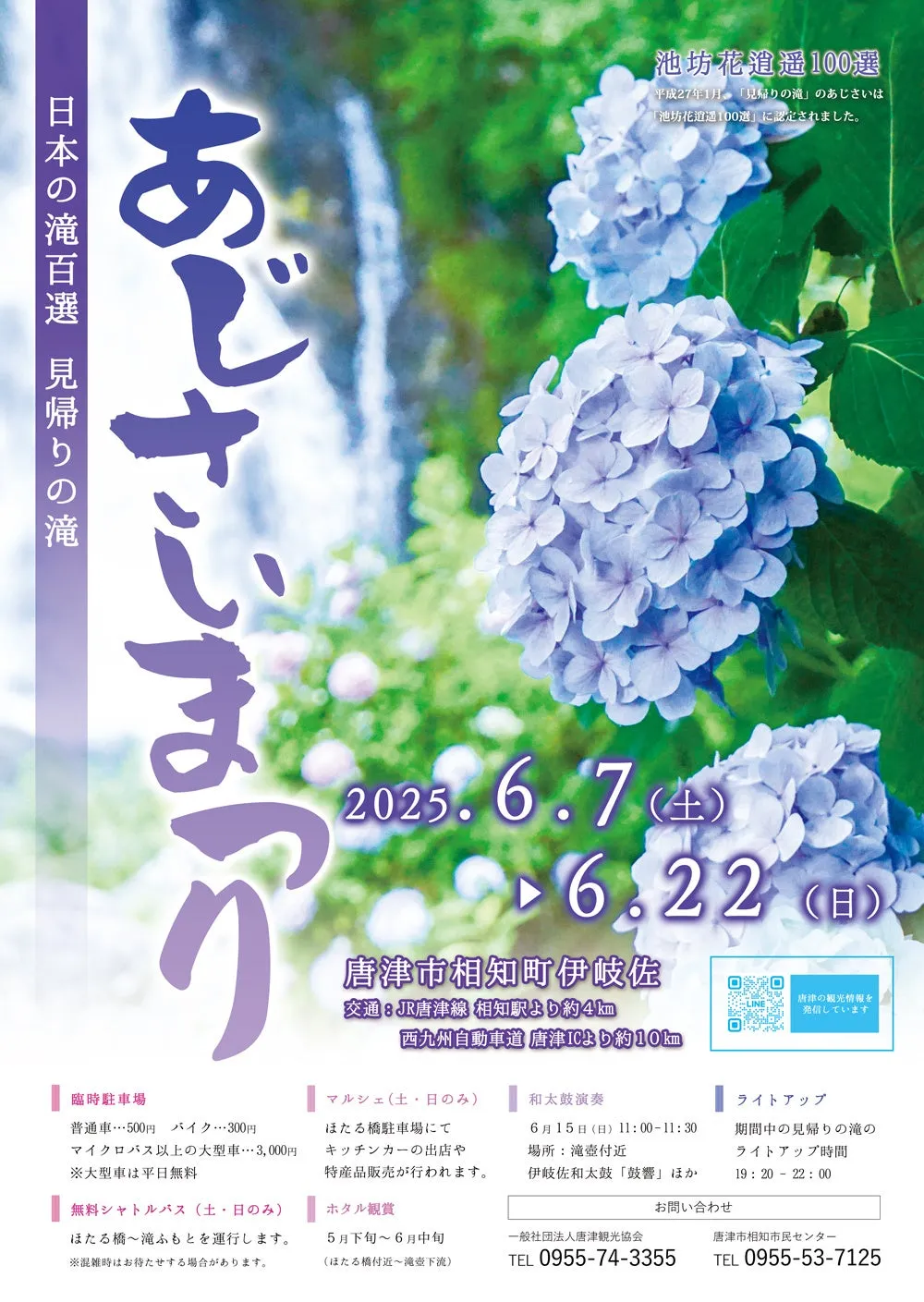 この「見帰りの滝あじさいまつり」は、美しい自然景観と地域の文化が織りなす、初夏の佐賀を代表する一大イベントです。滝の雄大さ、あじさいの可憐さ、そして地域の温かいおもてなしが一体となり、心に残る思い出を提供してくれることでしょう。梅雨の季節だからこそ楽しめる、日本ならではの風情を感じに、ぜひ佐賀県唐津市へ足を運んでみてはいかがでしょうか。詳細については、一般社団法人唐津観光協会(0955-74-3355)までお問い合わせください。