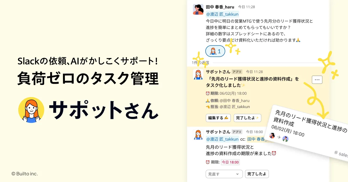 『サポットさん』を提供するのは、株式会社Builtoです。この企業は、生成AIを駆使したタスク管理ツールの開発を行っており、「チームが夢中になれる時間を増やす」というミッションのもと、日々機能の向上に努めています。
