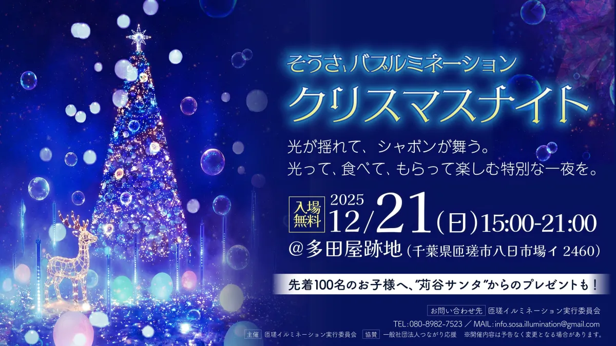 千葉県匝瑳市で2025年12月21日、地域で初めてのクリスマスイルミネーションイベント「そうさ バブルミネーション クリスマスナイト」が開催されます。このイベントは、一般社団法人つながり応援が協賛し、地域の子どもたちの素朴な問いかけに応えようという趣旨から生まれました。
