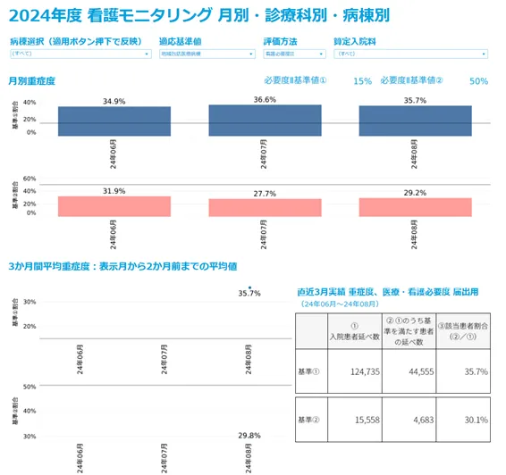 看護必要度モニタリング機能により、重症患者の割合を病棟別や診療科別に詳細に確認できるようになります。これにより、地域包括医療病棟の重症患者データがリアルタイムで把握可能になります。