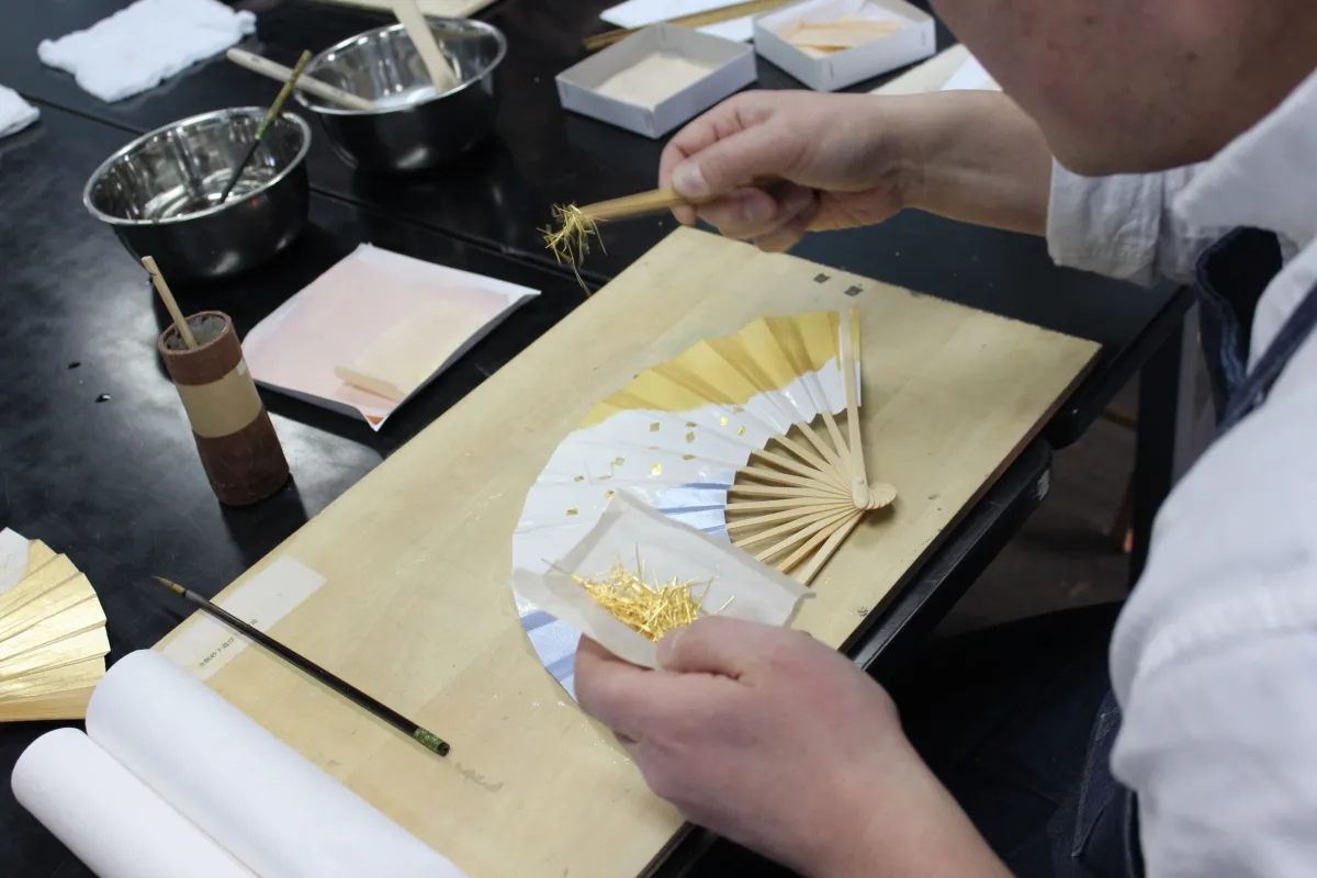 「砂子」とは、金箔や銀箔の粉末を用いてさまざまな素材に装飾を施す日本独自の技法です。この技術は約1000年前から受け継がれ、特に襖紙などに施されてきました。細かい箔の粒が砂のように見えることから、その名がつけられました。今回のイベントでは、参加者は扇子にこの砂子を使って模様をつけ、その作品を持ち帰ることができます。