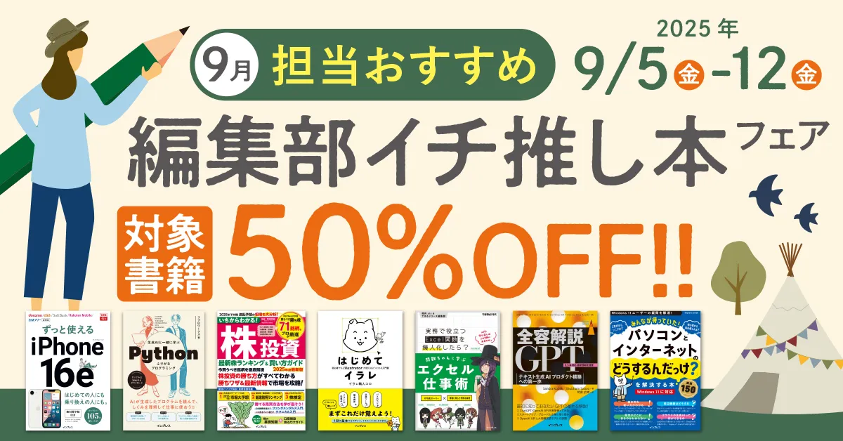 インプレスが2025年9月5日から12日までの期間、編集部が自信を持っておすすめする書籍を厳選した「担当おすすめ!編集部イチ推し本フェア」を開催します。このフェアでは、選りすぐりの電子書籍がなんと50%オフで提供されるため、読者には嬉しいチャンスです。