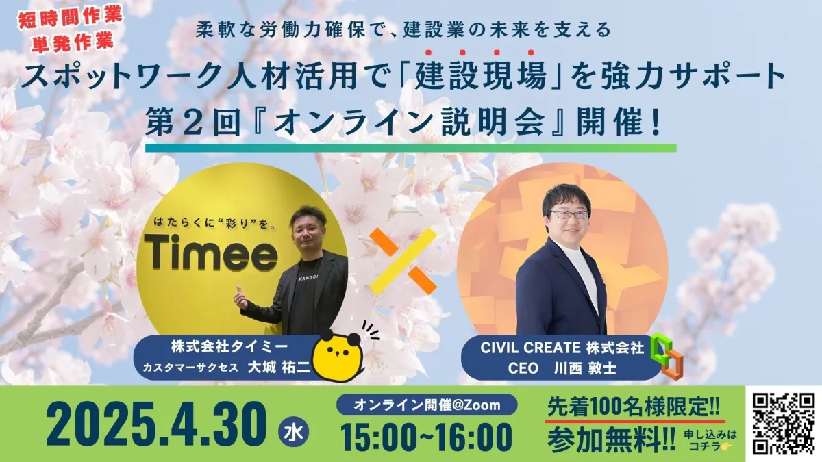 開催日は2025年4月30日(水)15:00~16:00で、参加費は無料です。本説明会は建設業の人材不足解決に課題を感じている方や、現場事務の効率化、DX推進を検討している方に特におすすめです。参加希望の方は、以下のURLからお申し込みください。