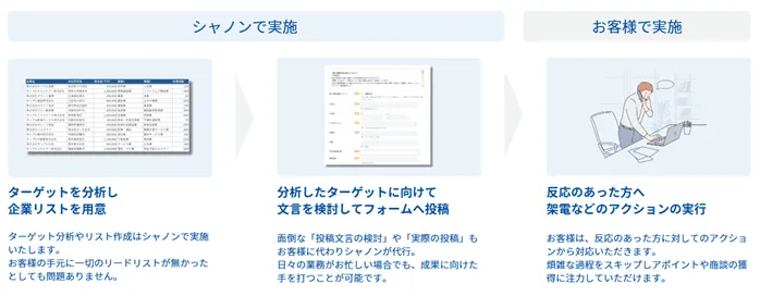 本サービスでは、企業のウェブサイトに設置された問い合わせフォームを活用し、ターゲット企業に直接アプローチを行います。具体的には、毎月最低1,000件のターゲット企業に対してフォーム投稿を代行します。これにより、他の企業よりもコストを抑えつつ、成果を生み出す工夫がなされています。