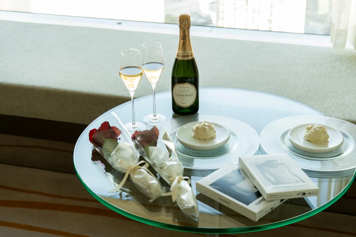 PREMIER PLANでは、ラグジュアリーなコットン製のHANROローブを身にまとい、特製のスイートルームで快適に過ごせます。さらに、パティシエ特製のメレンゲクッキーやシャンパンがセットになっており、贅沢な時間を提供します。夜景を一望できるプライベートなロケーションで、バラの花と共に特別感を演出します。
