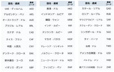 このサービスでは、30種類の通貨に対応しています。これにより、さまざまな国からの訪問者が、自分の通貨で簡単に支払いを行うことができるようになります。具体的には、アメリカドルやユーロ、オーストラリアドルなど、外国人旅行者のニーズに応えるラインナップが揃っています。