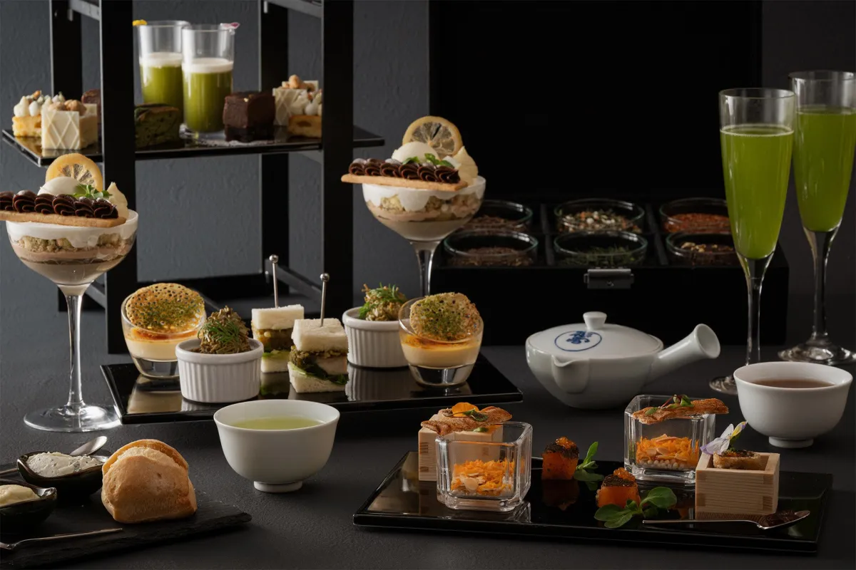 アフタヌーンティーの幕開けには、抹茶を使ったスパークリングカクテルが楽しめる。まろやかで深い風味がティータイムの始まりにぴったりの一杯だ。さらに、ほうじ茶をたっぷり使用したパフェでは、その優しい甘みと渋みを組み合わせ、レモンの酸味とアーモンドプラリネのコクが見事に調和している。